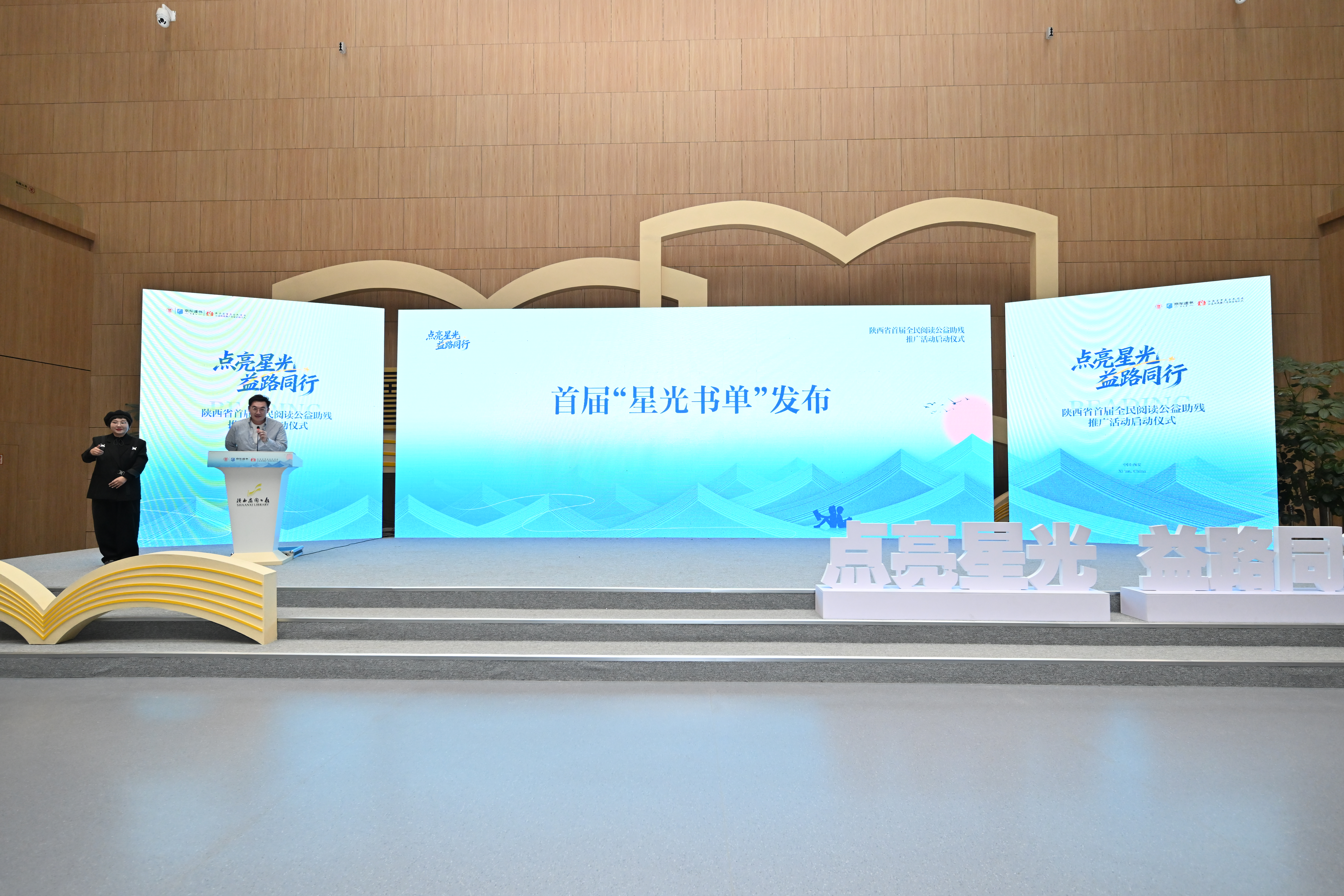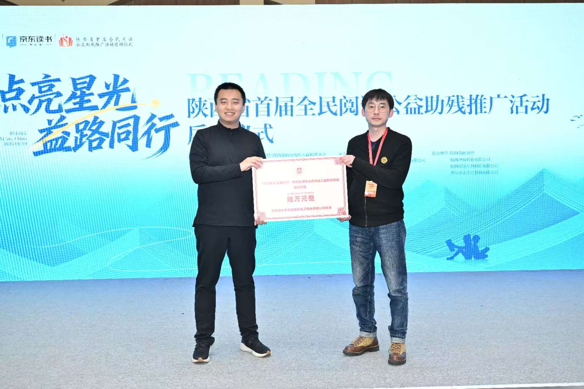 2026年1月19日下午,陕西省首届全民阅读公益助残推广活动启动仪式在陕西省图书馆高新分馆举行。活动以“点亮星光,益路同行”为主题,在西安市残疾人联合会指导下,由陕西省西安残疾人福利基金会与京东读书共同主办,陕西智图教育科技有限公司、北京京东叁佰陆拾度电子商务有限公司承办,并得到陕西省图书馆、陕西泽纳药业有限公司、陕西博涵生物科技有限公司、西安卓正医疗器械有限公司的协办支持。