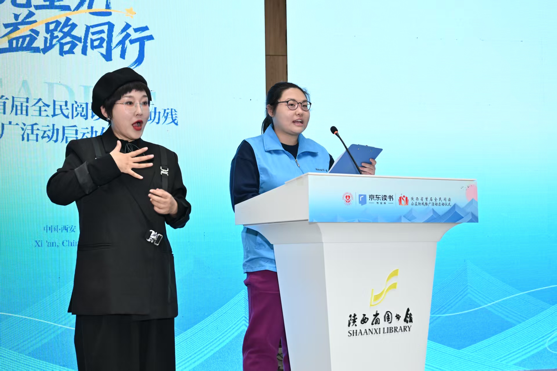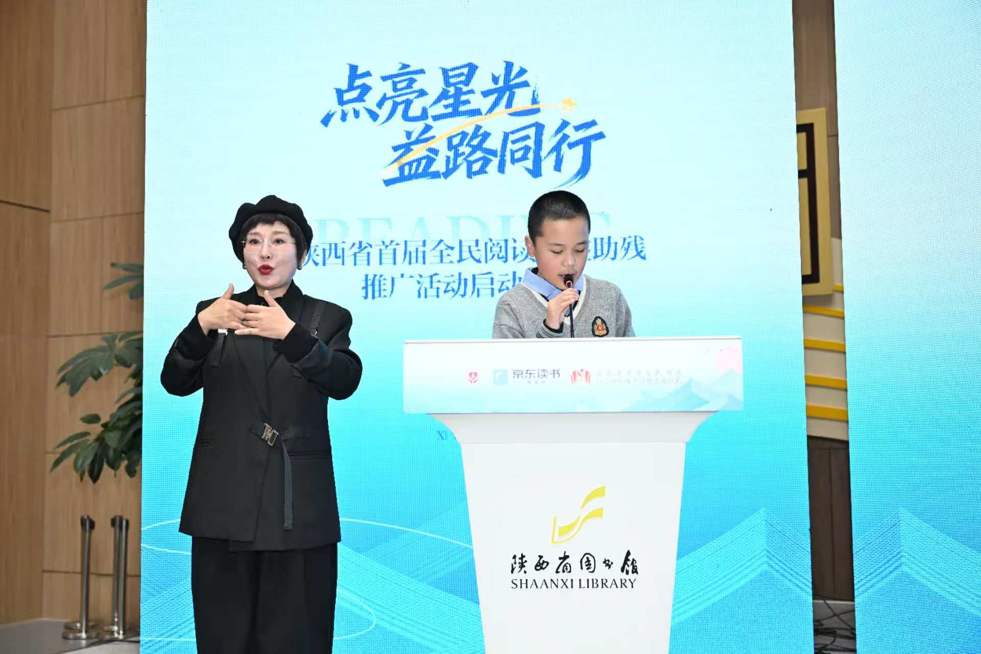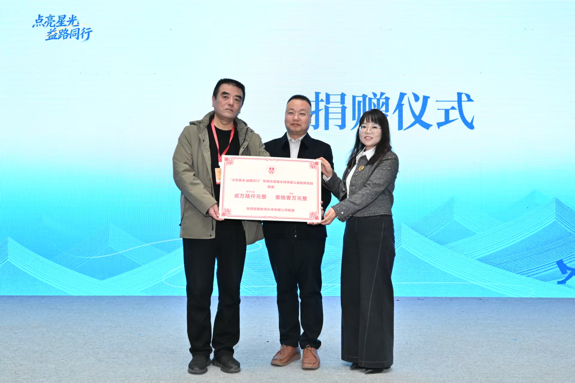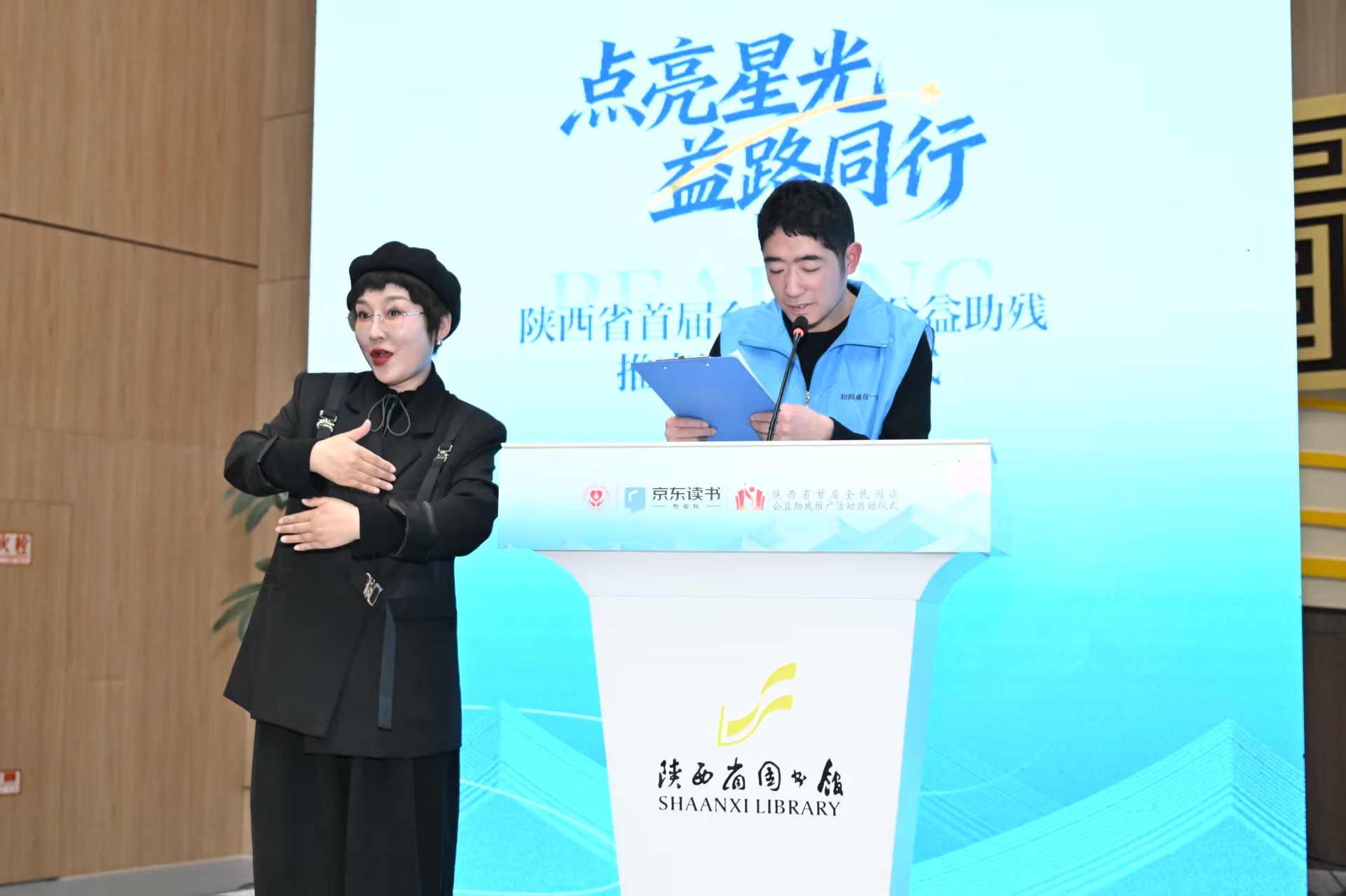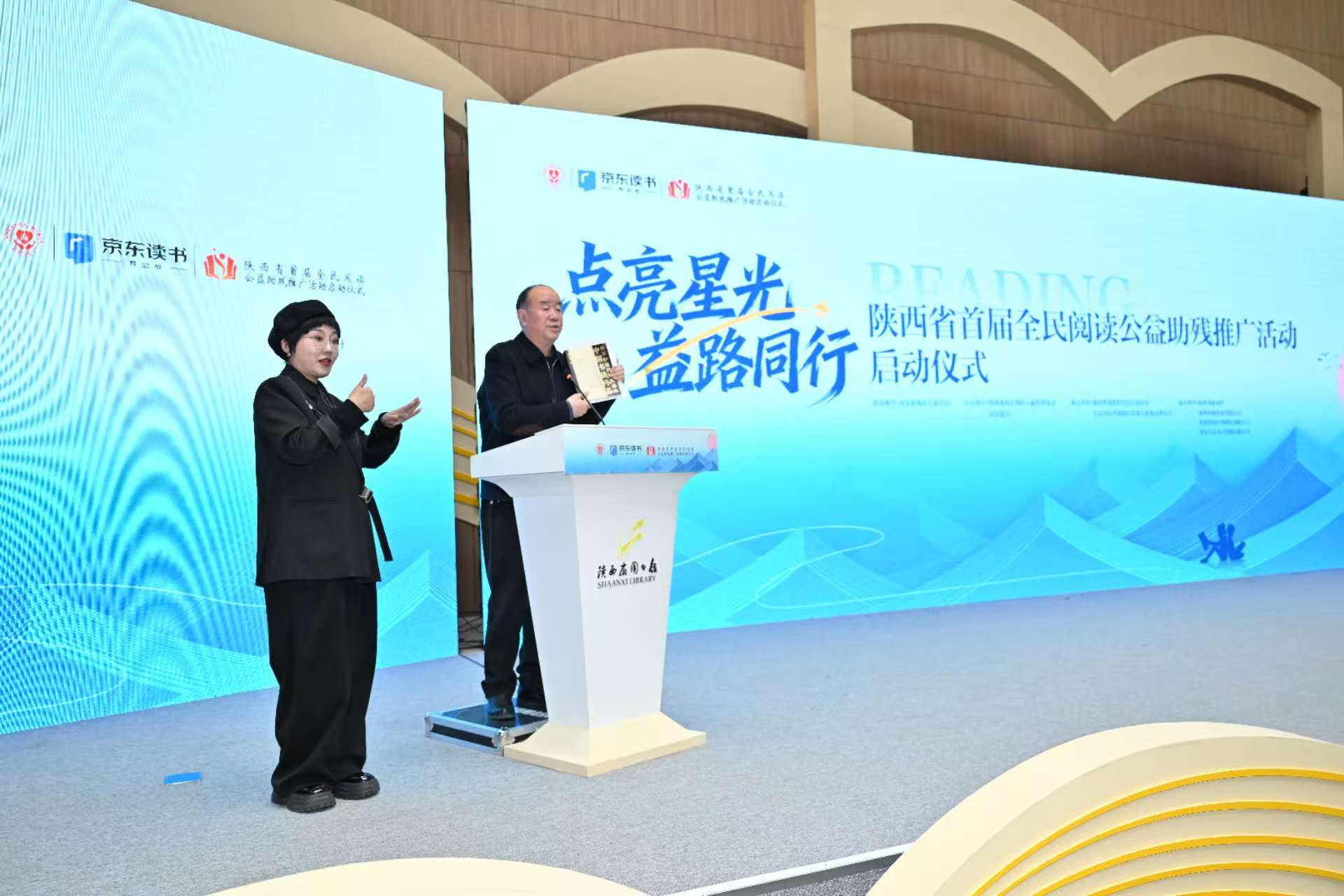 2026年1月19日下午,陕西省首届全民阅读公益助残推广活动启动仪式在陕西省图书馆高新分馆举行。活动以“点亮星光,益路同行”为主题,在西安市残疾人联合会指导下,由陕西省西安残疾人福利基金会与京东读书共同主办,陕西智图教育科技有限公司、北京京东叁佰陆拾度电子商务有限公司承办,并得到陕西省图书馆、陕西泽纳药业有限公司、陕西博涵生物科技有限公司、西安卓正医疗器械有限公司的协办支持。